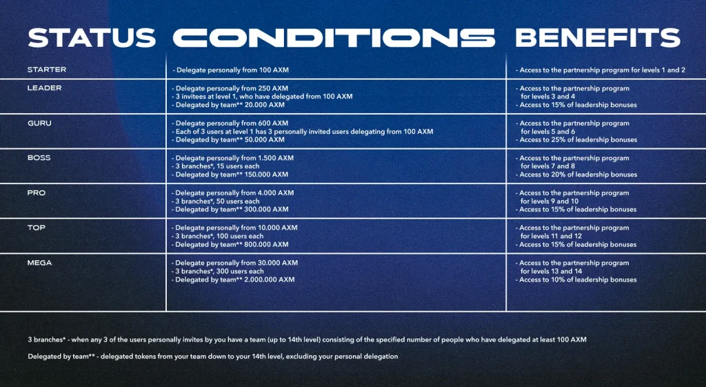 Whenever a user in your team (up to the 14th level) delegates AXM, a 15 % partnership fee is distributed across the uplines — including you.